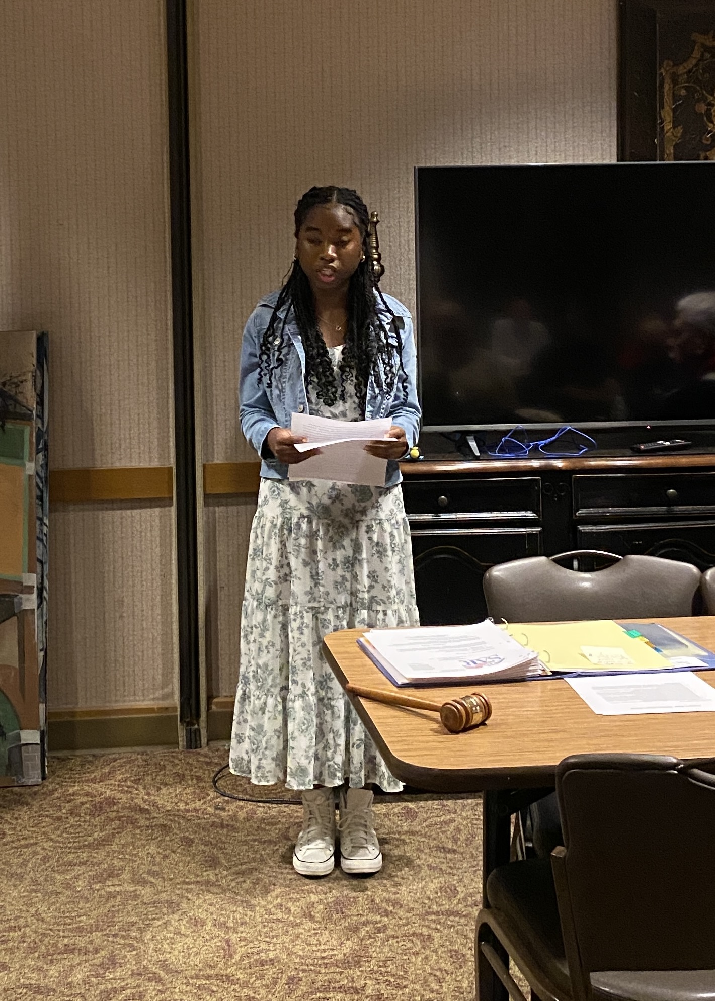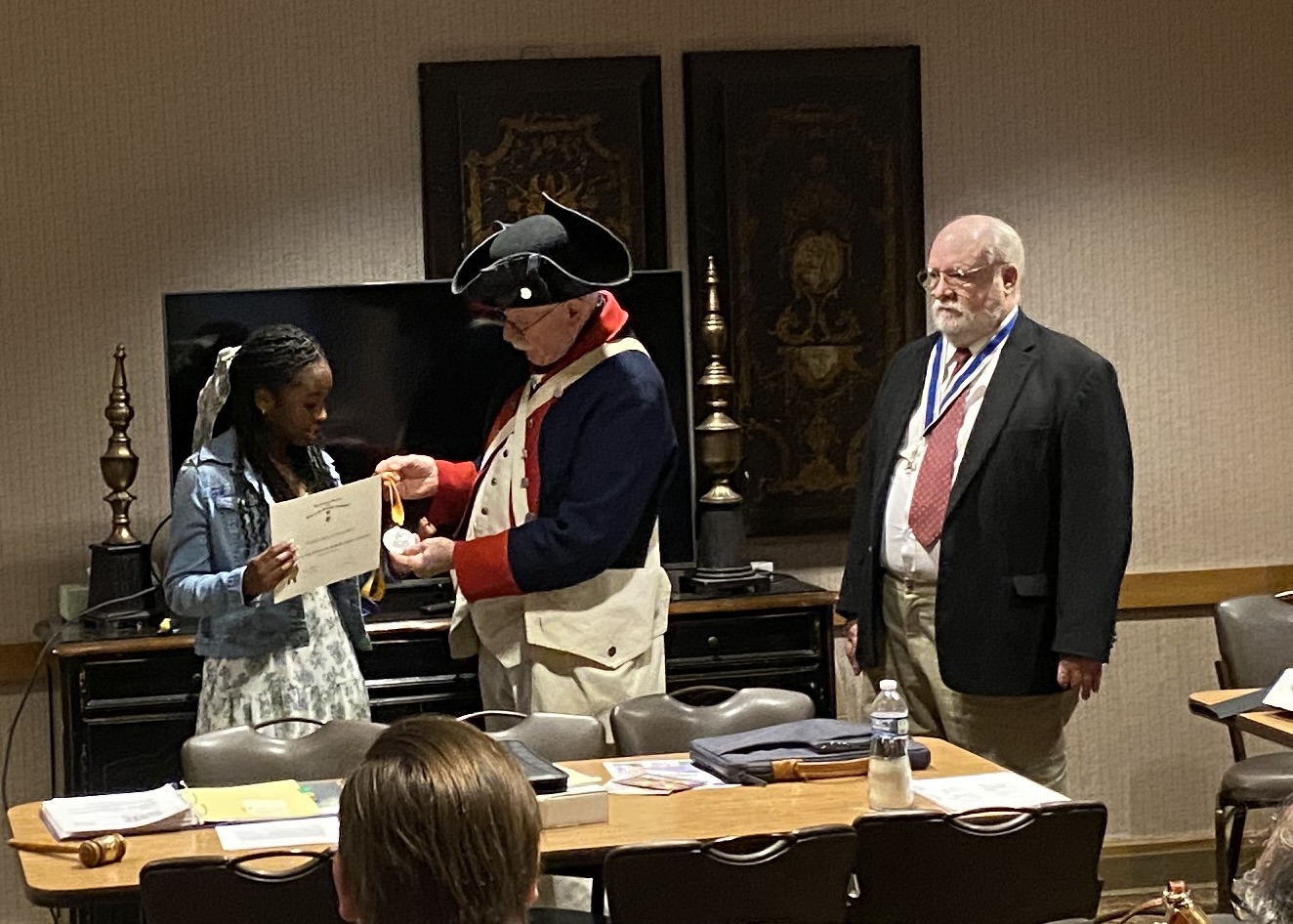 The participants of the Knight Essay contest were present. Vincent Kelly, second place, and Toni Adeagbo, first place. Toni’s essay advanced to the state level where it also took first place. Chapter members enjoyed the reading of her essay, “From The Caribbean to The Constitution”.